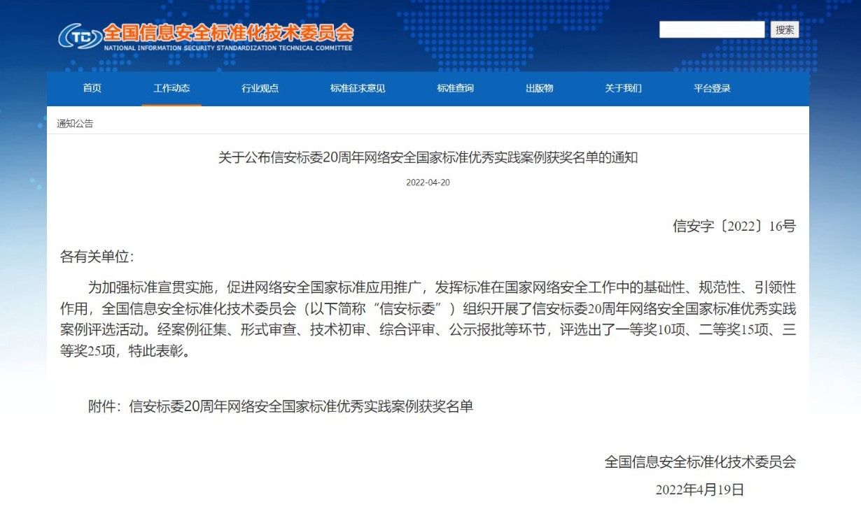 7項密碼國家標準案例獲信安標委20周年標準優(yōu)秀實踐案例獎