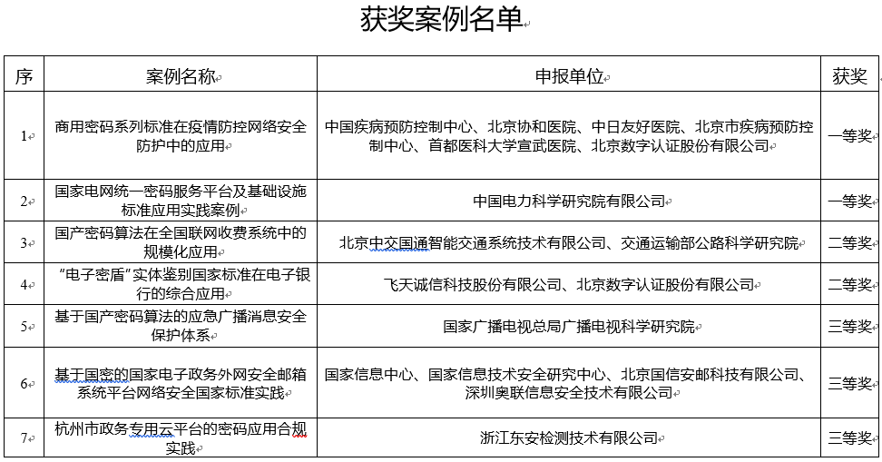 4月29日,全國信息安全標準化技術(shù)委員會發(fā)布信安標委20周年網(wǎng)絡安全國家標準優(yōu)秀實踐案例獲獎名單,《商用密碼系列標準在疫情防控網(wǎng)絡安全防護中的應用》等密碼領域國家標準案例分別榮獲一等獎2項、二等獎2項和三等獎3項(案例名單附后)。