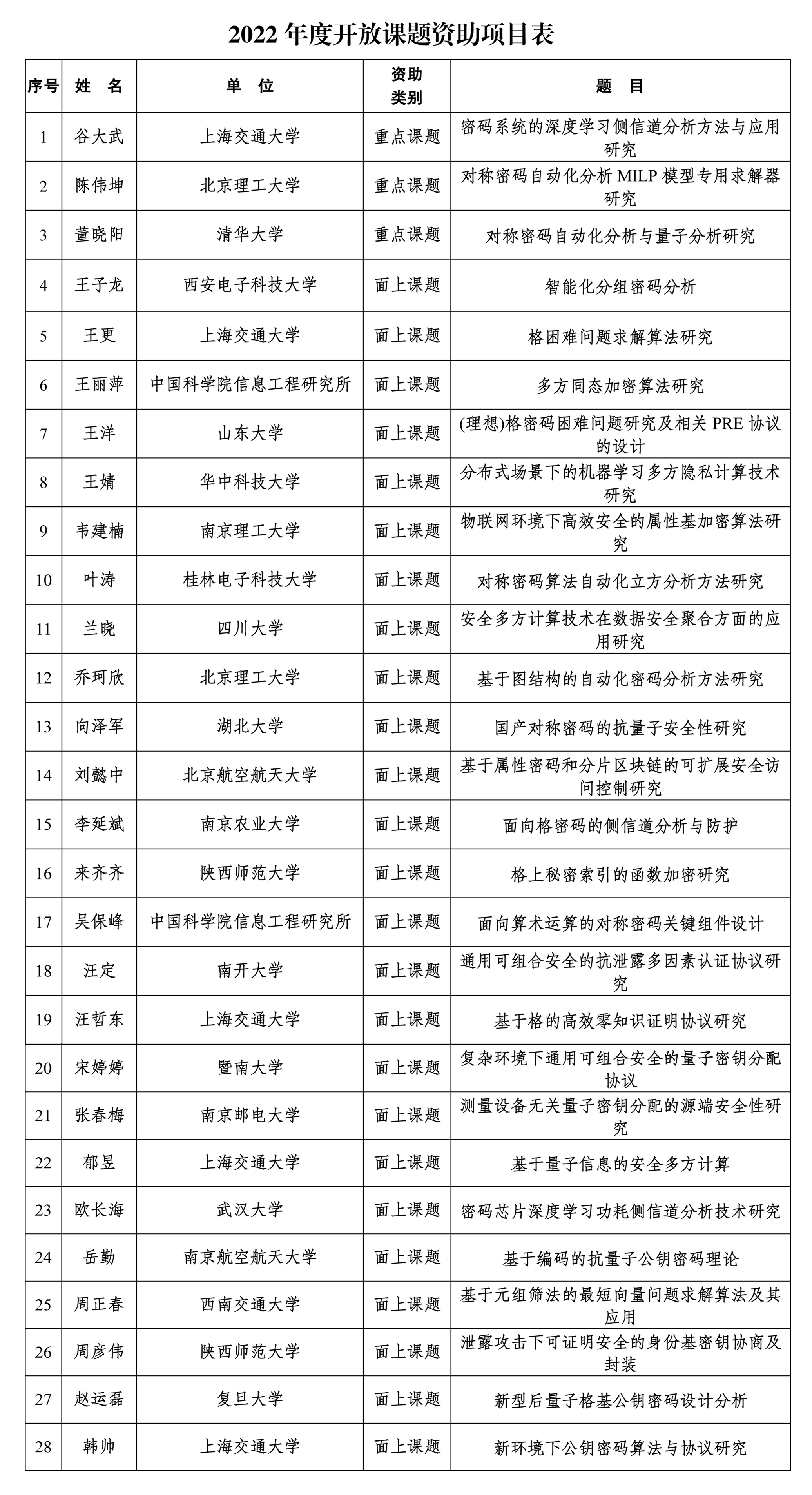 2022年度開放課題資助項(xiàng)目表