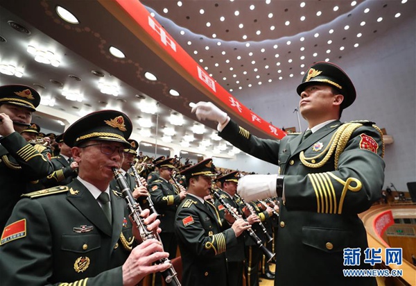 10月24日,中國共產(chǎn)黨第十九次全國代表大會閉幕會在北京人民大會堂舉行。這是軍樂團(tuán)奏《國際歌》。 新華社記者 王曄 攝